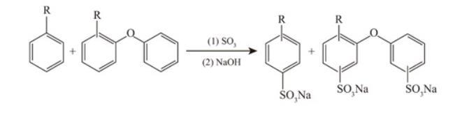 采用SO3膜式磺化工藝,改變烷基二苯醚與烷基苯的質(zhì)量比,將二者混合進(jìn)行磺化反應(yīng),然后用NaOH溶液中和,制得質(zhì)量分?jǐn)?shù)為25%的烷基二苯醚/烷基苯混合磺酸鹽,反應(yīng)方程式如下: