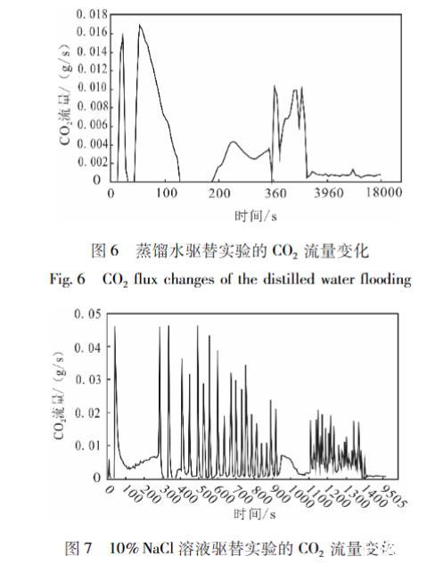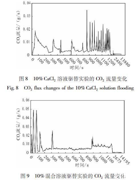 由CO2流量曲線可以發(fā)現(xiàn),以驅(qū)替液突破巖心為分界點(diǎn),也可以將CO2流量隨時(shí)間變化劃分為兩個(gè)階段:驅(qū)替液突破巖心前,CO2流量隨時(shí)間都發(fā)生較大的波動(活塞式驅(qū)替階段);驅(qū)替液突破巖心后,CO2氣體流量迅速減少,并且最終趨于一個(gè)穩(wěn)定值,CO2流量曲線幾乎不再波動帶式驅(qū)替階段)。因?yàn)榛钊津?qū)替階段中驅(qū)替出的CO2速率是劇烈變化的,所以CO2流量隨時(shí)間發(fā)生了較大的波動。這一穩(wěn)定值的出現(xiàn),是因?yàn)閷?shí)驗(yàn)開始一段時(shí)間后,巖心中可被驅(qū)替的超臨界CO2已被完全驅(qū)替,巖心中只剩下被毛細(xì)力所束縛的CO2。驅(qū)替液流出后,由于溫度和壓力的降低,本來溶解在驅(qū)替液中的CO2散逸出來,而驅(qū)替液初始溶解的CO2量是一定的,散逸出的CO2也是一定的,所以CO2氣體流量最終趨于穩(wěn)定。對比圖6一圖9發(fā)現(xiàn),10%NaCl和10%CaCl2溶液驅(qū)替實(shí)驗(yàn)的CO2流量曲線隨時(shí)間波動最為劇烈,混合溶液次之,波動最小的是蒸餾水驅(qū)替實(shí)液驗(yàn)的CO2流量曲線。
