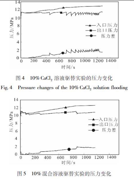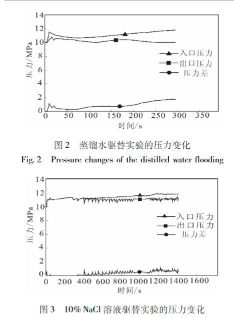 雖然在實(shí)驗(yàn)開始前,會通過回壓控制裝置將壓設(shè)置在10 MPa,但是在實(shí)驗(yàn)過程中巖心夾持度的巖心放器的人口、出口壓力會出現(xiàn)波動。通過實(shí)驗(yàn)得到通過回巖心夾持器人口、出口壓力及二者壓力差的變化