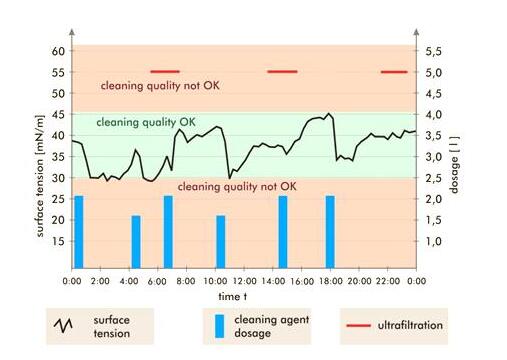 以上案例,通過連續(xù)對表面活性劑動態(tài)表面張力的監(jiān)測,清晰可靠地得知清洗池的表活性劑濃度的情況,以此反映清洗池的清洗能力??筛鶕?jù)數(shù)據(jù)補充適量表面活性劑,保證穩(wěn)定的清洗效果,從而達到清洗工藝的最優(yōu)化。