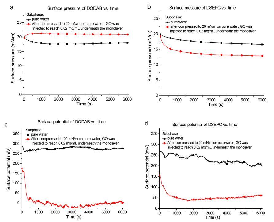 圖 2. (a) DODAB 和 (b) DSEPC 單層的表面壓力與經(jīng)過(guò)時(shí)間的關(guān)系。 單層的表面電位與經(jīng)過(guò)時(shí)間的關(guān)系 (c) DODAB 和 (d) DSEPC。 黑色曲線(xiàn):?jiǎn)螌釉诩兯畞喯嗌媳粔嚎s到 20 mN/m 的表面壓力。 紅色曲線(xiàn): 將單層壓縮至 20 mN/m 后,將 600 μL 1 mg/mL GO 分散體小心緩慢注入單層下方 進(jìn)入水亞相以達(dá)到 0.02 mg/mL 的 GO。