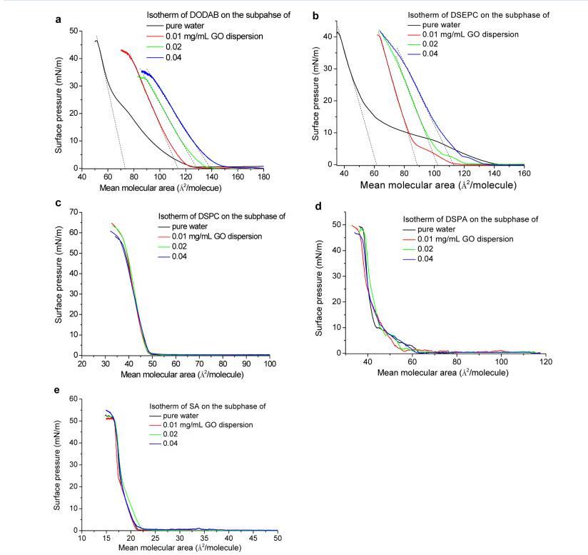 圖 1. 空氣-水或 GO 分散界面處脂質(zhì)的表面壓力-面積等溫線(xiàn):(a) 帶正電荷的 DODAB; (b) 積極 收費(fèi) DSEPC; (c) 帶中性電荷的 DSPC; (d) 帶負(fù)電的 DSPA; (e) 帶負(fù)電的 SA。 請(qǐng)注意,沒(méi)有表面壓力 在空氣-GO 分散界面處檢測(cè)到,而沒(méi)有在界面處擴(kuò)散脂質(zhì)。 每個(gè)分子軸面積的虛線(xiàn)的截距 表示每個(gè)分子的極限面積。