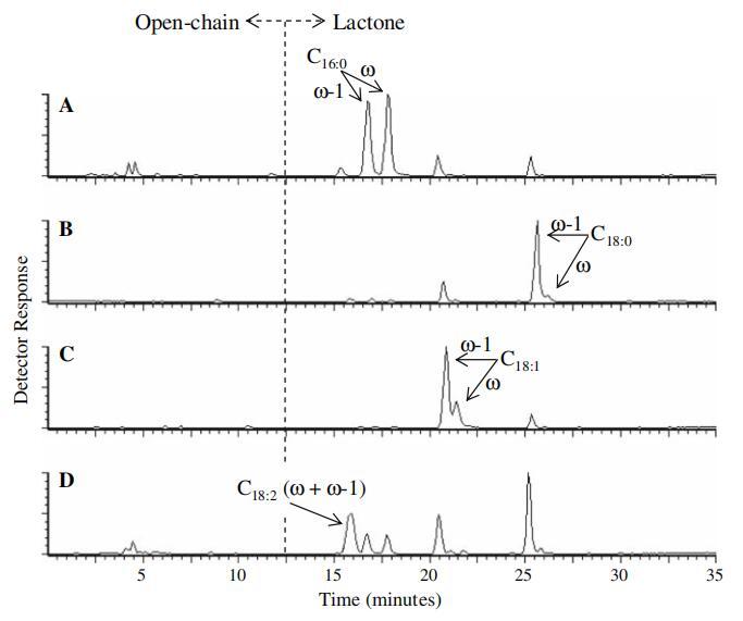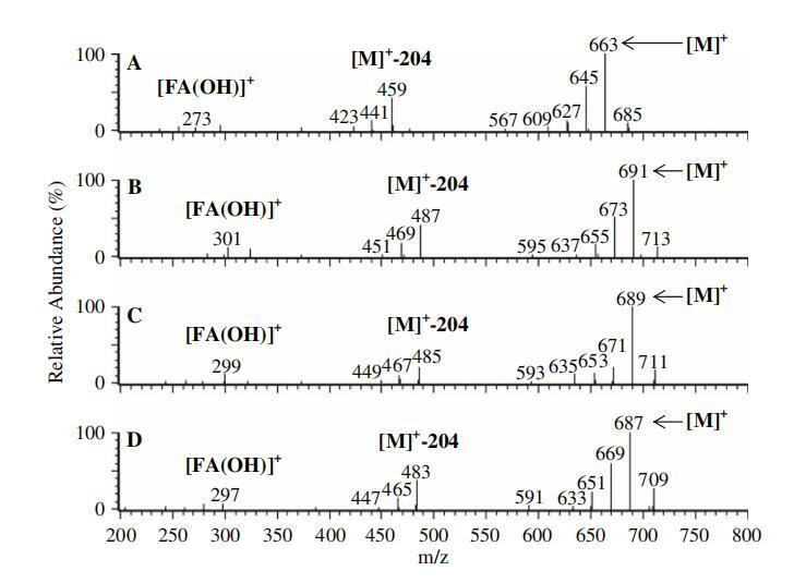 圖3正大氣壓化學(xué)電離(APCI)-來自圖2中每個(gè)TIC色譜圖基峰的質(zhì)譜圖。 圖2的TIC中的C16:0二乙酰化槐脂內(nèi)酯(RT=16.7分鐘)、圖2的TIC中的C18:0二乙酰化槐脂內(nèi)酯(RT=25.2分鐘)、圖2c的TIC中的C18:1二乙?;敝瑑?nèi)酯(RT=20.7分鐘)和圖2d的TIC中的C18:2二乙?;敝瑑?nèi)酯(RT=15.8)。 ([M]+=質(zhì)子化分子離子;[M]+-204=質(zhì)子化分子離子-減去乙?;禾牵ㄙ|(zhì)量204);[FA(OH)]+=質(zhì)子化羥基脂肪酸)
