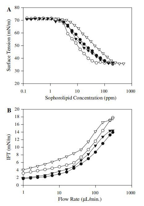 圖4槐脂濃度和流速對(duì)水溶液中的表面張力(a)和界面張力(b)的影響,包括來自葡萄糖和棕櫚酸(SL-p;d)、硬脂酸(SL-s;s)、油酸(SL-o;)和亞油酸(SL-l;r)的槐脂。