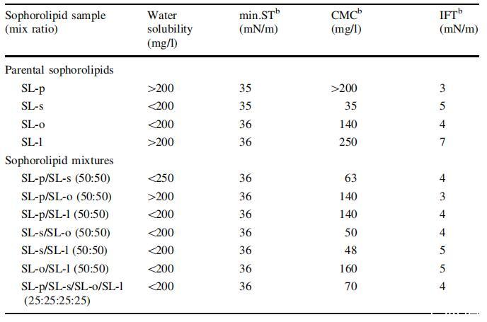 4個(gè)親代SLs中的每一個(gè)都產(chǎn)生了35–36 mN/m的可比最小ST,但CMC值明顯不同(表3)。 SL-p和SL-l的CMC值均大于200 mg/l,而SL-s和SL-o的CMC值分別為35 mg/l和140 mg/l。 IFT值范圍為3 mN/m(SL-p)至7 mN/m(SL-l)。 為了控制SLs的表面活性,以50:50的混合比制備混合物,并重新評(píng)估其性能。 各混合物的內(nèi)酯分布見表2。 經(jīng)分析,最小ST和IFT相對(duì)不變,但CMC值確實(shí)因SL混合物而異。 通過混合獲得了介于48 mg/l和140 mg/l之間的臨界膠束濃度。 有趣的是,CMC值最低的SL混合物都含有SL-s成分。 特別是SL-s的CMC值為35 mg/l; 即使是以25:25:25:25的比例包含所有4種親本SL的混合物,其CMC值(70 mg/l)也比不含SL-s成分的其他混合物低。 這些數(shù)據(jù)表明,SL-s對(duì)水的表面活性性能的影響更為顯著。 通過使用較少的SL-s,可以實(shí)現(xiàn)相等的最小ST和IFT。 性能控制和高產(chǎn)量將通過降低成本最終有助于SLs的工業(yè)應(yīng)用。 這些數(shù)據(jù)還指出,通過將不同的SLs混合在一起以獲得所需的性質(zhì),可以在一定程度上控制SLs的表面活性性質(zhì)。 雖然未達(dá)到表明這些SLs單獨(dú)具有優(yōu)越表面活性劑性能的最低標(biāo)準(zhǔn),但其性能可能足以允許其作為石化表面活性劑添加劑的使用量增加,以便在大量使用表面活性劑的應(yīng)用中盡量減少不利的環(huán)境影響。 SL-p和SL-l的CMC值均大于200 mg/l,而SL-s和SL-o的CMC值分別為35 mg/l和140 mg/l。IFT值范圍為3 mN/m(SL-p)至7 mN/m(SL-l)。為了控制SLs的表面活性,以50:50的混合比制備混合物,并重新評(píng)估其性能。各混合物的內(nèi)酯分布見表2。經(jīng)分析,最小ST和IFT相對(duì)不變,但CMC值確實(shí)因SL混合物而異。通過混合獲得了介于48 mg/l和140 mg/l之間的臨界膠束濃度。有趣的是,CMC值最低的SL混合物都含有SL-s成分。特別是SL-s的CMC值為35 mg/l;通過將SL-s與SL-p、SL-o和SL-l以50:50的比例混合,CMC值分別增加到63 mg/l、50 mg/l和48 mg/l。即使是以25:25:25:25的比例包含所有4種親本SL的混合物,其CMC值(70 mg/l)也比不含SL-s成分的其他混合物低。這些數(shù)據(jù)表明,SL-s對(duì)水的表面活性性能的影響更為顯著。通過使用較少的SL-s,可以實(shí)現(xiàn)相等的最小ST和IFT。性能控制和高產(chǎn)量將通過降低成本最終有助于SLs的工業(yè)應(yīng)用。這些數(shù)據(jù)還指出,通過將不同的SLs混合在一起以獲得所需的性質(zhì),可以在一定程度上控制SLs的表面活性性質(zhì)。雖然未達(dá)到表明這些SLs單獨(dú)具有優(yōu)越表面活性劑性能的最低標(biāo)準(zhǔn),但其性能可能足以允許其作為石化表面活性劑添加劑的使用量增加,以便在大量使用表面活性劑的應(yīng)用中盡量減少不利的環(huán)境影響。