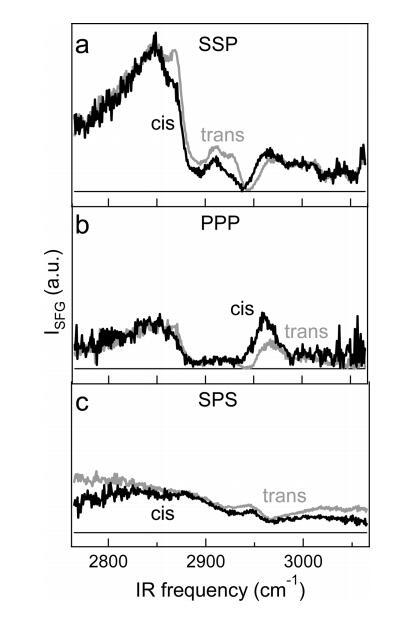 圖5.(a)在P的反式和順式狀態(tài)下,每分子65?2面積的DT Azo-5P純單層的標準化VSFG光譜與SSP極化分別為6和20 mN/m。(b)與a部分類似,但對于PPP極化。(c)反式和順式狀態(tài)的SPS極化中的SFG光譜( ~ 每分子78?2),壓力為2和15 mN/m。三個面板具有相同的垂直刻度。