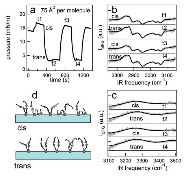 圖4。 (a) 在每分子面積為75?2的脂質(zhì)/H2O界面處,作為光開關(guān)脂質(zhì)時間函數(shù)的表面壓力。 用370和450 nm光照射 ~ 100秒分別產(chǎn)生順式(高壓)和反式(低壓)狀態(tài)。 壓力的微小劇烈波動是由于樣品高度的變化,以校正水的蒸發(fā)。 (b和c)CH和OH區(qū)域(灰色)中相應(yīng)的VSFG光譜以及洛倫茲線形狀模型的擬合(見正文)。 為了清晰起見,光譜已被抵消。 t1至t4對應(yīng)于面板a中獲取光譜的時間。 (d) 脂質(zhì)尾部方向的示意圖。 光開關(guān)脂質(zhì)的偶氮苯部分用灰色圓圈表示。