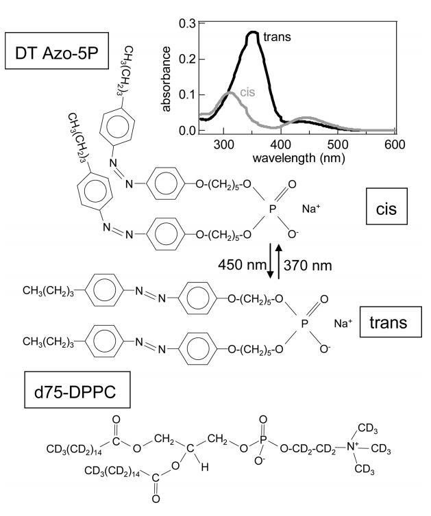 圖1。 順式和反式構(gòu)型的光開關(guān)脂質(zhì)DT Azo-5P和d75 DPPC的分子結(jié)構(gòu)。 右上角的插圖顯示了CHCl3中DT Azo-5P的紫外/可見光譜( ~ 在370nm(順式狀態(tài))和450nm(反式狀態(tài))下輻照約10s后,使用7μM,1cm的反應(yīng)杯。