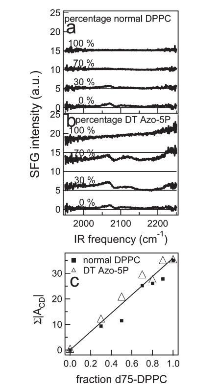 圖9。 (a) 正常DPPC和d75 DPPC不同混合物的CD區(qū)VSFG光譜。 圖中給出了混合物中正常DPPC的百分比。 為清晰起見,光譜偏移,細線表示零。 (b) 與a部分類似,但適用于DT Azo-5P與d75 DPPC的混合物。 (c) 通過擬合文中描述的VSFG光譜獲得的CD振動振幅之和,作為含正常DPPC或DT Azo-5P的二元混合物中分數(shù)d75 DPPC的函數(shù)。 在本實驗中,為了獲得混合物的高質(zhì)量數(shù)據(jù),IR通量很高,導(dǎo)致通過VSFG光譜中相對較高的CH2和CD2振幅觀察到的脂質(zhì)尾部出現(xiàn)小的無序。