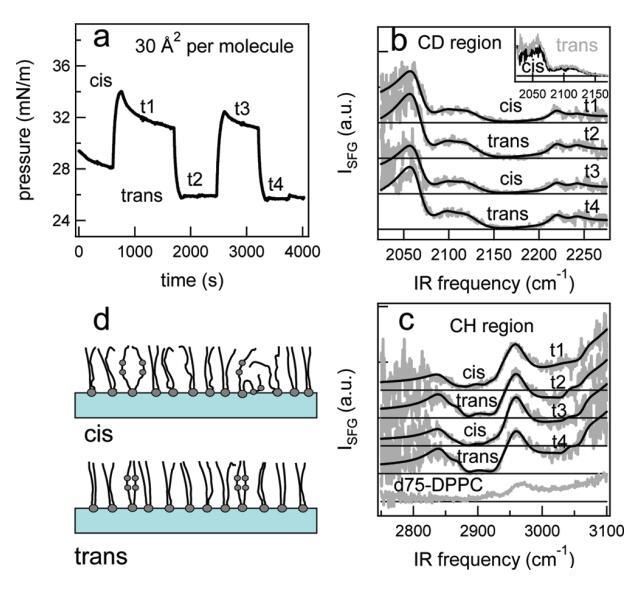 圖7。在脂質(zhì)/H2O界面處,DT Azo-5P/d75 DPPC的1:5混合物的結(jié)果,每個分子的面積為30?2。(a) 表面壓力與時間的關(guān)系。用370和450 nm光照射~100秒分別產(chǎn)生順式(高壓)和反式(低壓)狀態(tài)。壓力的微小劇烈波動是由于樣品高度的變化,以校正水的蒸發(fā)。順式狀態(tài)下表面壓力的降低可能是由于單層的松弛或膠束或囊泡的形成減少了表面脂質(zhì)的數(shù)量。(b) 相應(yīng)的VSFG光譜(灰色)以及CD區(qū)域的擬合。為了清晰起見,光譜已被抵消。插圖顯示了相互重疊的反式和順式光譜,以強調(diào)差異。(c) VSFG光譜(灰色)以及用于引導(dǎo)眼睛進入CH區(qū)域的擬合。底部曲線顯示了在P時純d75 DPPC的光譜~ 40百萬/米。(d) 脂質(zhì)尾部方向的示意圖。光開關(guān)脂質(zhì)的偶氮苯部分用灰色圓圈表示。