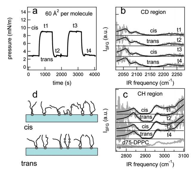 圖6。在脂質(zhì)/H2O界面處,DT Azo-5P/d75 DPPC的1:5混合物的結(jié)果,每個分子的面積為60?2。(a) 表面壓力與時間的關(guān)系。用370和450 nm光照射~100秒分別產(chǎn)生順式(高壓)和反式(低壓)狀態(tài)。壓力的微小劇烈波動是由于樣品高度的變化,以校正水的蒸發(fā)。(b) 相應(yīng)的VSFG光譜(灰色)以及CD區(qū)域的擬合。為了清晰起見,光譜已被抵消。(c) VSFG光譜(灰色)以及用于引導(dǎo)眼睛進入CH區(qū)域的擬合。底部曲線顯示了在P時純d75 DPPC的光譜~ 40百萬/米。(d) 脂質(zhì)尾部方向的示意圖。光開關(guān)脂質(zhì)的偶氮苯部分用灰色圓圈表示。