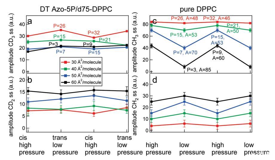 圖8.在d75 DPPC和DT Azo-5P(左)的5:1比率的實驗中,d75 DPPC和純正常DPPC(右)的擬合結(jié)果。(a)CD3對稱拉伸振動模式的振幅作為不同密度的光開關(guān)脂質(zhì)狀態(tài)的函數(shù);(b)CD2對稱拉伸振動模式的振幅作為不同密度的光開關(guān)脂質(zhì)狀態(tài)的函數(shù);右圖顯示了純DPPC的類似結(jié)果,壓力與左圖相似,其中(c)CH3對稱拉伸振動模式的振幅和(d)CH2對稱拉伸模式的振幅。共振的寬度和頻率在擬合中是固定的。