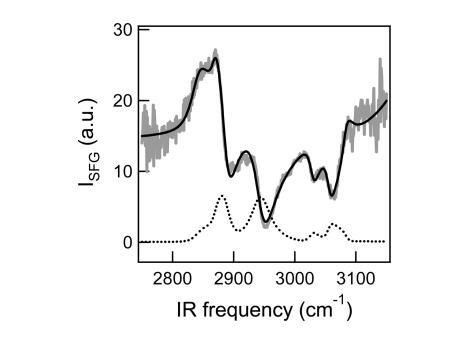 DT Azo-5P單分子膜的振動和頻發(fā)生光譜(VSFG)。圖3a描繪了在3 mN/m的表面壓力和75?2的分子面積下,處于反式狀態(tài)的光脂DT Azo-5P凝聚相的單層的灰色VSFG光譜。光譜顯示了CH2的共振(~2840 cm-1)和CH3對稱拉伸模式(~2860 cm-1),CH2和CH3不對稱拉伸模式~2890和2940 cm-1,以及3000 cm-1以上的芳香CH信號,源自偶氮苯部分。2,11-13 3100 cm-1以上,光譜主要由水亞相的OH振動控制。頻譜在低頻時有一個不尋常的高(非零)基線,這表明一個高非共振信號。為了檢查這種可能性,使用以下表達式擬合光譜:11,12
