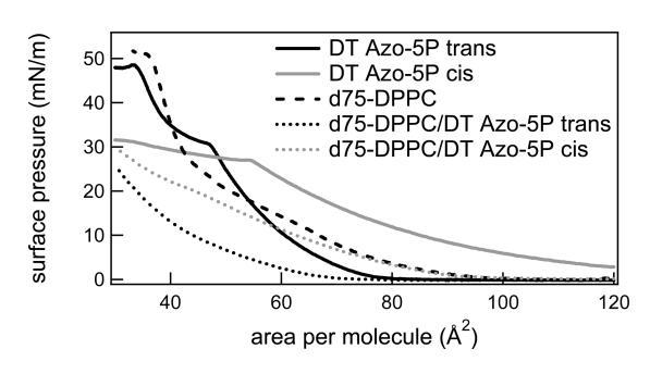 圖2。反式和順式狀態(tài)下的光開關(guān)脂質(zhì)DT Azo-5P(實線)、d75-DPPC(虛線)以及光開關(guān)兩種狀態(tài)下的1:5摩爾比的光開關(guān)脂質(zhì)和d75-DPPC(虛線)的表面壓力與面積等溫線。