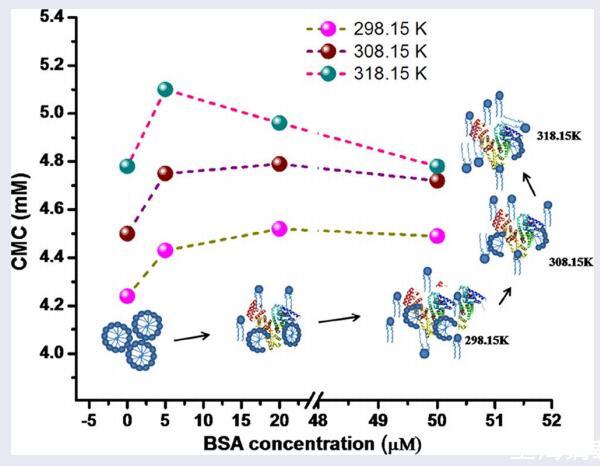 用表面張力法研究了牛血清白蛋白對IL型gemini表面活性劑[C10-4-C10im]Br2表面性質(zhì)的影響。研究了不同溫度下臨界膠束濃度(CMC)與BSA濃度的關系。[C10-4-C10im]Br2的CMC隨著BSA濃度的增加以及系統(tǒng)溫度的升高而增加。界面參數(shù),即;計算了最大表面過量濃度(Γmax)、每分子最小面積(Amin)和CMC下的表面壓力(ΔCMC)。此外,利用表面張力數(shù)據(jù)評估了吸附和膠束化的熱力學參數(shù)。結果表明,[C10-4-C10im]Br2與BSA的結合是自發(fā)的、放熱的。該過程是熵驅(qū)動的,疏水相互作用是主要驅(qū)動力。