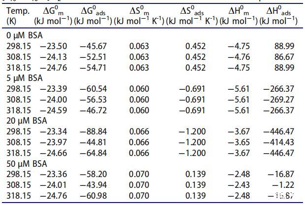表2. [C10-4-C10im]Br2在不同溫度下吸附和膠束化的熱力學(xué)參數(shù)與BSA濃度的關(guān)系。