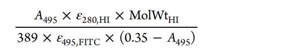 熒光光譜法用于選擇含有FITC-HI的小份樣品。 FITC探針在494nm激發(fā)時顯示出517nm的發(fā)射。 人們注意到,當(dāng)探針與HI共軛時,F(xiàn)ITC發(fā)射的強度增加。 吸收光譜法用于確定HI與FITC的比率,該比率由下式計算得出。21