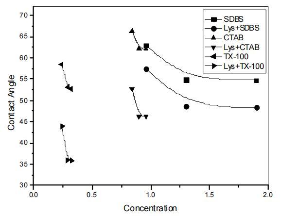 圖2。在溶菌酶存在和不存在的情況下,不同種類(lèi)表面活性劑的濃度與接觸角曲線圖