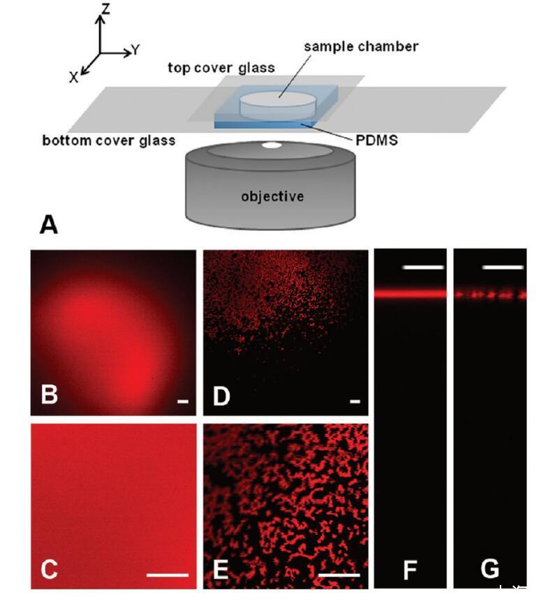 圖1。(A)樣品室和倒置顯微鏡設(shè)置。(B-G)在AWI條件下,pH 7.2,離子強度=193 mM的PBS中HSA-TR的共焦圖像。(B,C)HSA-TR(0.050 mg/mL)或(D,E)HSA-TR(0.025 mg/mL)的XY平面圖像。圖像C和E使用4倍光學(xué)變焦。穿過(F)HSA-TR(0.050 mg/mL)或(G)HSA-TR(0.025 mg/mL)AWI的XZ平面圖像。比例尺:20μm。