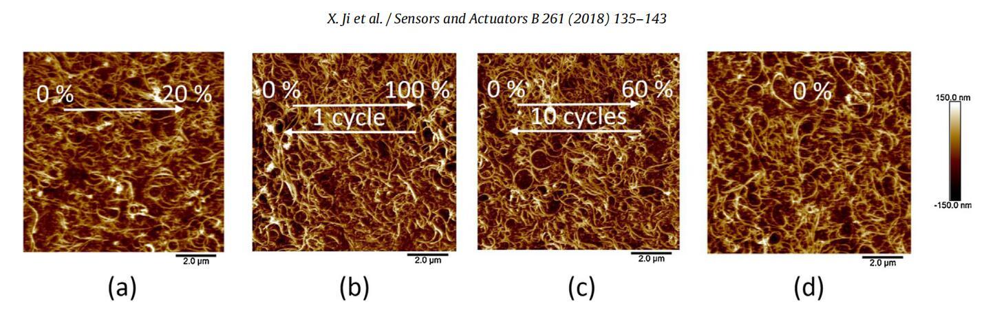 從圖5a(施加在PDMS基板上的20%單軸應(yīng)變)可以看出,WCNT在拉伸方向上輕微變形,但保持互連。對于應(yīng)變?yōu)?%的器件,在100%單軸應(yīng)變后或在60%單軸應(yīng)變的10個周期后拍攝,AFM圖像顯示互連的MWCNT網(wǎng)絡(luò),表明拉伸至100%(圖5b)或在60%單軸應(yīng)變的10個周期后(圖5c)不會破壞網(wǎng)絡(luò)。對于所有拉伸條件,與未施加任何應(yīng)變的樣品相比,一旦樣品松弛至0%應(yīng)變,則在該長度范圍內(nèi)未檢測到顯著的形態(tài)變化(圖5d)。