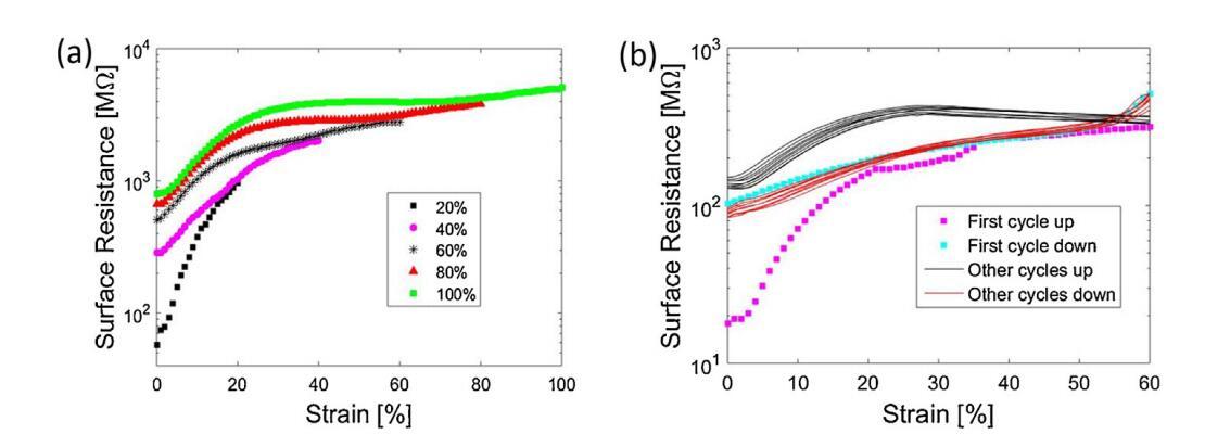 圖6a顯示了在20%和100%之間增加最大應(yīng)變的不同連續(xù)循環(huán)中,樣品表面電阻的變化。僅顯示拉伸循環(huán)。在前20%應(yīng)變期間,電阻增加約一個數(shù)量級,表明MWCNT網(wǎng)絡(luò)內(nèi)的互連比降低。當(dāng)恢復(fù)到0%應(yīng)變時,電阻沒有達(dá)到其初始值,而是增加了6倍。這突出了由于機械變形導(dǎo)致的電性能的不可逆變化。隨著最大施加應(yīng)變的增加,每個循環(huán)都會發(fā)生這種情況。然而,可以觀察到,在恢復(fù)到0%應(yīng)變后,表面電阻的增加在60%應(yīng)變以上不太明顯。值得注意的是,單層電極在100%單軸應(yīng)變下仍保持導(dǎo)電。
