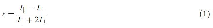 使用熒光偏振儀系統(tǒng)(Beacon 2000)在25.0±0.2°C下進(jìn)行所有熒光各向異性測(cè)量。RB用作熒光探針,其濃度保持在0.1μM。分別使用570和630 nm的激發(fā)和發(fā)射波長測(cè)量熒光各向異性。當(dāng)發(fā)射偏振器平行或垂直于偏振激發(fā)方向時(shí),每個(gè)熒光強(qiáng)度稱為I||或I┴,分別地各向異性是強(qiáng)度差(I||-I)的比率┴)總強(qiáng)度(I||+2I)┴)如等式1[24,25]所示: