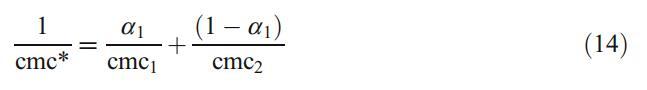 這些結(jié)果已通過使用規(guī)則溶液理論得到進(jìn)一步證實(shí),該理論不僅表征了混合膠束中的相互作用參數(shù)bmic 12,而且還解釋了與理想的偏差[32]。X1是膠束中DPS的摩爾分?jǐn)?shù),可根據(jù)以下方程式迭代計(jì)算: