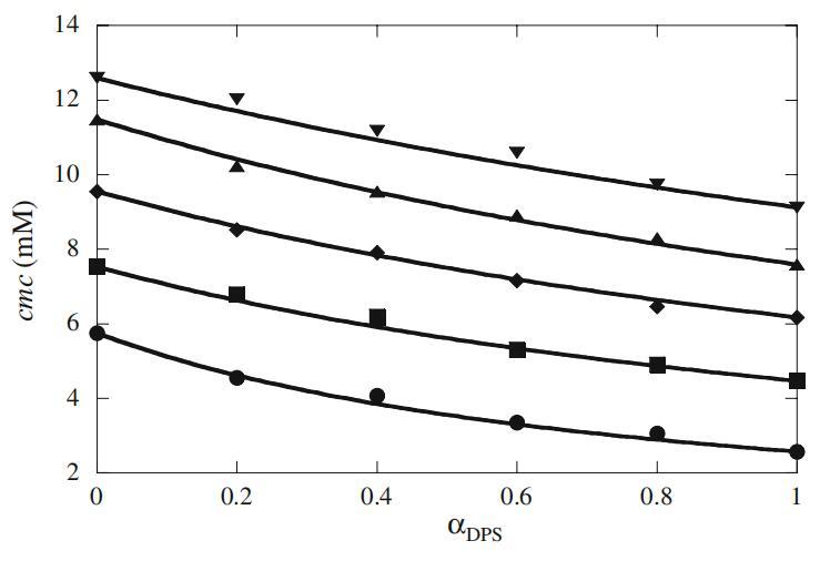 圖8 Mega-10+DPS混合系統(tǒng)的混合臨界膠束濃度(cmc)與αDPS的曲線圖。填充圓、正方形、菱形、三角形和反向三角形分別表示存在0(填充圓)、2(填充正方形)、4(填充菱形)、6(填充三角形)和8(填充反向三角形)mMα-CD時(shí)的實(shí)驗(yàn)cmc。實(shí)線表示理想的cmc