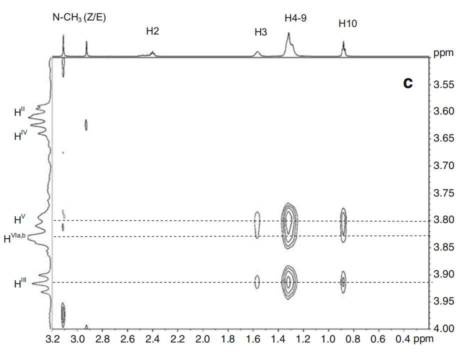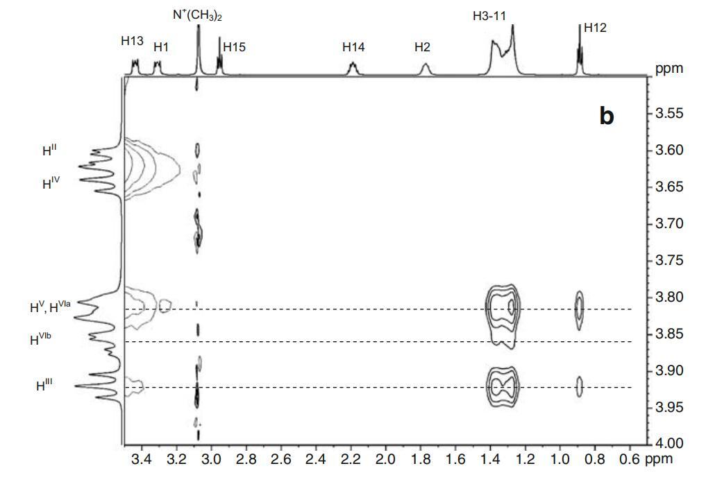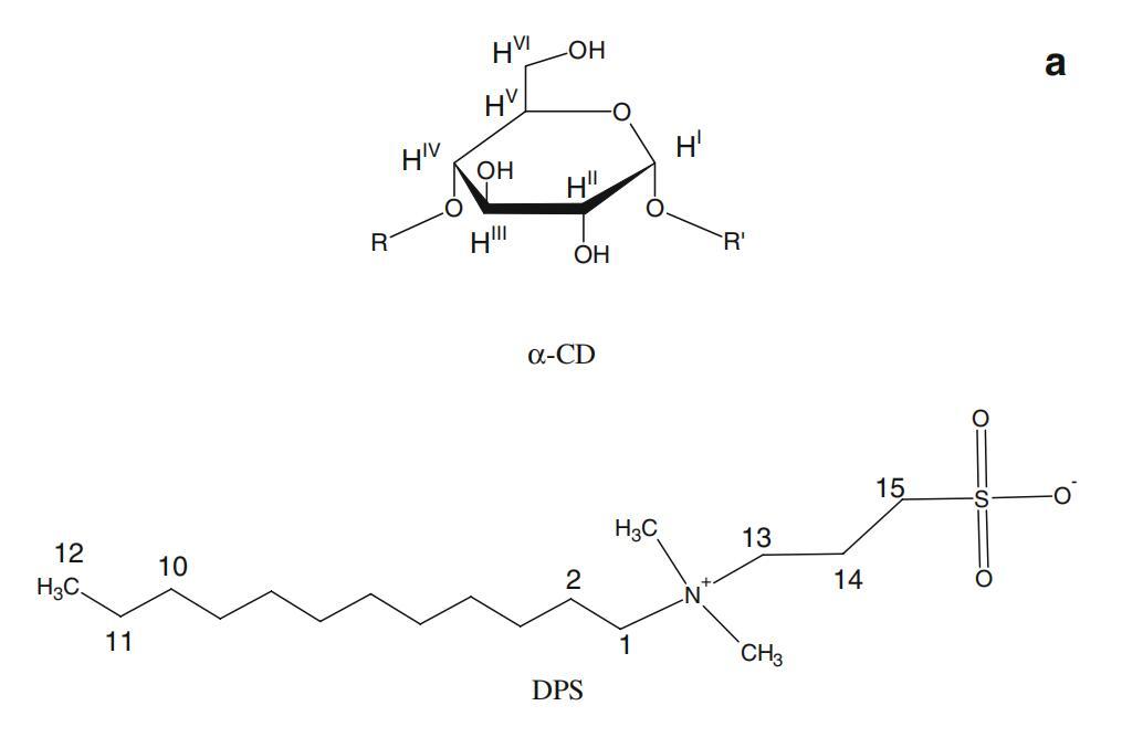 圖7a顯示了α-CD、DPS和Mega-10的示意圖,以簡化表面活性劑原子與CD原子的相互作用。2DROESY數(shù)據(jù)證明表面活性劑的烷基鏈包含在α-環(huán)糊精的疏水腔中。光譜如圖7b和c所示。可以看到表面活性劑共振與位于環(huán)糊精空腔內(nèi)的HIII、HV和HVI共振的交叉峰。未觀察到分子(HI、HII和HIV)外部與環(huán)糊精原子的相互作用。對于這兩種表面活性劑,與HIII和HV的相互作用似乎覆蓋了從末端甲基到H3的整個(gè)烷基鏈。這意味著幾個(gè)不同的復(fù)雜幾何形狀和穿透深度之間的快速交換。在鎘原子和親水性頭基之間沒有觀察到相互作用。