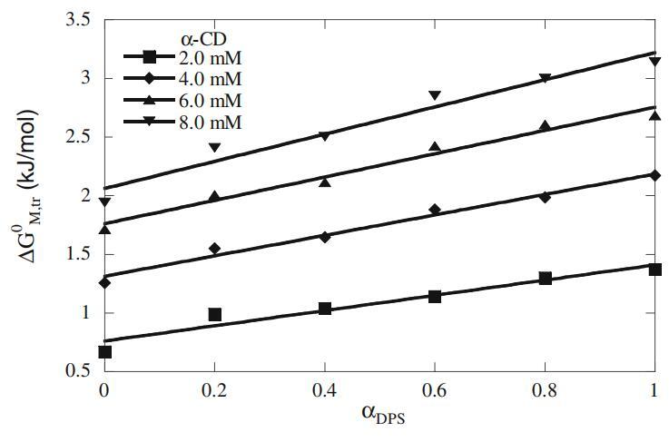 根據(jù)cmc值,我們評估了純表面活性劑系統(tǒng)和混合表面活性劑系統(tǒng)在不存在和存在α-CD的情況下的膠束化標(biāo)準(zhǔn)自由能(數(shù)據(jù)未顯示)[27],隨后,通過膠束轉(zhuǎn)移標(biāo)準(zhǔn)自由能評估添加劑對膠束化的影響(?GM,tr 0),從水相到含有α-CD的水相[19]。這些值如圖5所示,在不同α-CD濃度下,在整個(gè)DPS摩爾分?jǐn)?shù)范圍內(nèi)為正值,表明α-CD的存在使膠束形成不利。此外,這些值隨著α-CD濃度的增加而線性增加,在高α-CD濃度下斜率更高,表明混合膠束的形成延遲。