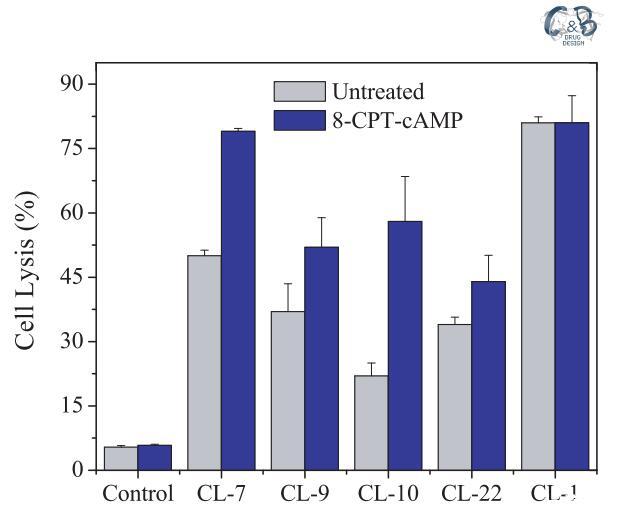 為了排除上述結(jié)果由CHO-K1細(xì)胞的某些固有特性引起的可能性,我們?cè)诹硪粋€(gè)選定的細(xì)胞A549上進(jìn)行了相同的實(shí)驗(yàn),其細(xì)胞表面電荷與CHOK1細(xì)胞幾乎相同(表1)。由于肽將受到來自A549和CHO-K1細(xì)胞的相同拉力,靜電吸引對(duì)肽-細(xì)胞相互作用的潛在影響被最小化或消除。A549細(xì)胞的表面pH值為7.15,高于肽CL-9、CL-10和CL-22的過渡pH值,但低于肽CL-7的過渡pH值(pH值為7.35)。同樣,CL-7被證明是A549細(xì)胞上最活躍的肽(圖3)。在存在8-CPT-cAMP的情況下,A549細(xì)胞的表面pH值降低至pH=6.55(表3),低于所有受試裂解肽的過渡pH值(表1)。因此,四種pH敏感裂解肽對(duì)8-CPTcAMP處理的A549細(xì)胞的裂解活性顯著增加(圖3)。應(yīng)注意的是,與pH敏感肽不同,當(dāng)細(xì)胞被8-CPT-cAMP處理時(shí),pH不敏感肽CL-1對(duì)A549和CHO-K1細(xì)胞的活性幾乎沒有變化(圖2和圖3)。