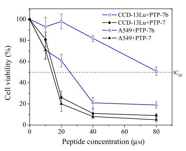 在細(xì)胞毒性研究中,選擇了研究充分的pH敏感裂解肽PTP-7b(FLGALFKALSHL)(6,9)。由于PTP-7b的過渡pH(pH=7.25)低于A549的表面pH,但高于CCD-13Lu,因此裂解肽PTP-7b對(duì)A549的毒性可能比對(duì)CCD-13Lu細(xì)胞的毒性更大。選擇PTP-7b的親本肽PTP-7(FLGALFKALSKLL),一種pH不敏感的裂解肽(6,9)作為對(duì)照。如圖8所示,盡管肽PTP-7對(duì)兩種細(xì)胞的活性相同,但pH敏感肽PTP-7b對(duì)A549的毒性大約是對(duì)CCD-13Lu的三倍。