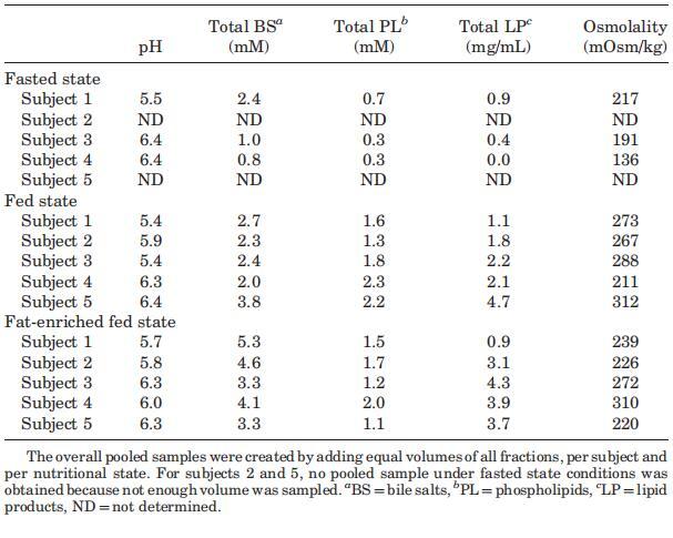 攝入Sure Plus1或Scandishake Mix1后前2小時的滲透壓通常高于禁食狀態(tài)下的HIF,盡管禁食狀態(tài)和兩種喂食狀態(tài)之間未達到顯著差異。禁食狀態(tài)滲透壓值一般為低滲透,或接近等滲透值。224 mOsm/kg的總體中值為低滲透性,與Brouwers等人1和Deferme等人報告的人類十二指腸吸出物的平均滲透壓一致。,38但高于Perez de la Cruz Moreno等人報告的平均值。24在給藥(n?3)后,在混合樣品中獲得的滲透壓較低,與Kalantzi等人11和Gisolfi等人報告的滲透壓較好。39在喂食和富含脂肪的喂食狀態(tài)下均發(fā)現(xiàn)高滲值,尤其是在消化的前3小時。在喂食和富含脂肪的喂食狀態(tài)下,總的中位數(shù)滲透壓為等滲透壓(分別為285和278 mOsm/kg)。進食后180分鐘內(nèi)較高的滲透壓與膽汁鹽濃度、磷脂或脂質(zhì)產(chǎn)物總量無關(guān)。Kalantzi等人19將吸入十二指腸內(nèi)容物的高滲值歸因于雙糖和果糖復合碳水化合物的存在,以及后者的緩慢吸收。在本研究中未確定總碳水化合物水平,因此,該陳述無法驗證。