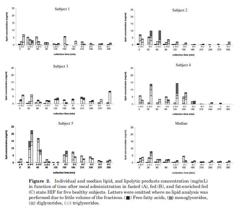 對于四名受試者(S2、S3、S4、S5),在禁食狀態(tài)HIF中發(fā)現(xiàn)微量脂質(zhì)(平均0.4?0.3 mg/mL),這與Armand等人12報告的受試者1十二指腸吸出物中的禁食水平0.6 mg/mL相符,禁食狀態(tài)下的脂質(zhì)濃度等于或高于30-120分鐘期間在喂食和富含脂肪的喂食狀態(tài)下測定的濃度(圖2)。這一觀察的可能原因可能與胃滯留時間和/或小腸上皮細胞的周轉(zhuǎn)率有關(guān),從而釋放膜脂。在喂食和富含脂肪的喂食狀態(tài)之間,根據(jù)個體特征,沒有發(fā)現(xiàn)實質(zhì)性差異。然而,中位數(shù)曲線顯示,進食30分鐘后,在高脂肪喂養(yǎng)狀態(tài)下,總脂質(zhì)濃度顯著增加。由于沒有觀察到脂質(zhì)產(chǎn)物在管腔內(nèi)出現(xiàn)延遲,因此可以得出結(jié)論,服用液體膳食的脂肪含量的應用差異不會改變胃排空。先前已經(jīng)證明,給予恒河猴的碳水化合物、蛋白質(zhì)和脂肪等熱量負荷產(chǎn)生了相似的胃排空率,這表明胃排空是根據(jù)膳食的熱量密度進行調(diào)節(jié)的,而不管其營養(yǎng)成分如何。32