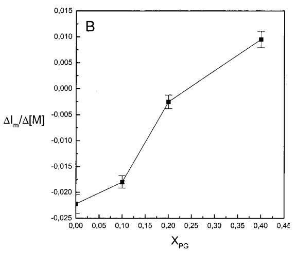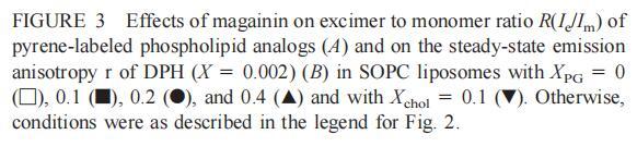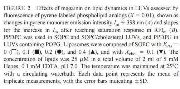 繼上述單層研究之后,有興趣探索肽對脂質(zhì)動(dòng)力學(xué)的影響。這是通過使用熒光光譜和不同脂質(zhì)成分的LUV完成的,記錄芘標(biāo)記的熒光磷脂類似物PPDPC或PPDPG的發(fā)射光譜(均為X=0.01)。對于SOPC LUV,添加magainin 2導(dǎo)致芘熒光顯著猝滅,芘單體和準(zhǔn)分子發(fā)射強(qiáng)度平行降低,如Im所示(圖2)。作為XPG的一項(xiàng)功能,還研究了馬蓋寧2與脂質(zhì)體結(jié)合的后果。當(dāng)XPG從0.1增加到0.4時(shí),觀察到由于magainin 2在398 nm處逐漸增強(qiáng)的Im(RFIm),而Im的初始增量在明確定義的PG/magainin 2化學(xué)計(jì)量比~2、3和5時(shí)趨于平穩(wěn)(圖2 A)。在這個(gè)初始階段之后,直到給定的化學(xué)計(jì)量比,還有第二個(gè)過程,其斜率也隨著XPG的增加而增加(圖2b)。在XPG=0和0.1時(shí),Magainin 2僅引起Ie/Im的輕微變化,而在XPG=0.2和0.4時(shí),分別減少10%和25%是明顯的(圖3 A)。為了區(qū)分脂質(zhì)動(dòng)力學(xué)中兩種性質(zhì)不同的變化,即側(cè)向遷移率和微結(jié)構(gòu)域形成,作為上述Ie/Im變化的根本原因,我們還通過測量DPH的熒光各向異性r來評估?;滍樞虻淖兓▓D3 B)。在缺乏酸性磷脂的情況下,Magainin 2幾乎不會(huì)引起r的變化(圖3B)。然而,隨著XPG的增加,加入magainin 2后脂質(zhì)堆積和酰基鏈順序逐漸增加(圖3b),XPG=0.4時(shí),r最大增加1.4倍。值得注意的是,XPG=0.1時(shí)Ie/Im沒有變化以及酰基鏈順序的增加表明PPDPG正在發(fā)生微觀富集。有趣的是,在存在膽固醇(Xchol=0.1)的情況下,由于馬蓋寧2的作用,Im和Ie都顯著降低,Ie/Im的變化不顯著(圖2A和3A)。如前所述(van Ginkel et al.,1989),添加肽前r的增加(圖3 B)揭示了通過在膜中摻入膽固醇而增強(qiáng)的膜順序。然而,在膽固醇存在的情況下,magainin 2對r沒有進(jìn)一步的影響(Xchol=0.1,圖3b)。