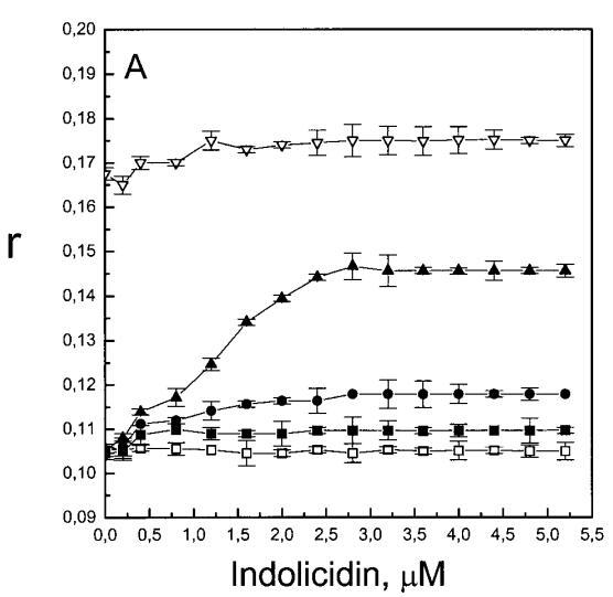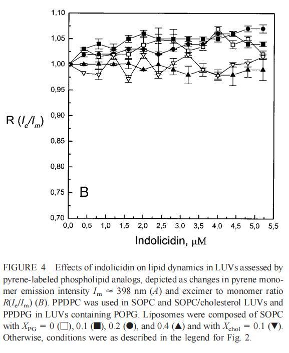 與magainin 2類似,吲哚青霉素與陰離子和兩性離子囊泡的膜結(jié)合非常不同(圖1b、4和5),與先前的平衡透析研究一致(Ladokhin et al.,1997)。雖然芘熒光的猝滅顯示吲哚肽被分配到SOPC雙層中,但對膜?;滍樞驇缀鯖]有影響(圖5)。相反,吲哚西啶與陰離子膜的相互作用導(dǎo)致脂酰鏈順序增加,明顯表現(xiàn)為DPH熒光各向異性增加,并對XPG呈S形依賴(圖5)。與magainin 2相反,吲哚西丁導(dǎo)致芘單體和準(zhǔn)分子發(fā)射強(qiáng)度顯著平行降低,與脂質(zhì)成分無關(guān),Ie/Im變化較?。▓D4)。相應(yīng)地,吲哚西丁誘導(dǎo)酸性PG富集到微區(qū)。有趣的是,在吲哚西丁/脂質(zhì)摩爾比為1:20以下,芘Im的減少順序?yàn)閄PG=0.40.20.10(圖4a),而在吲哚西丁/脂質(zhì)摩爾比為1:10時(shí),Im的減少對XPG的依賴性相反。這種變化的可能機(jī)制如下。在低肽/脂摩爾比時(shí),吲哚西丁似乎被調(diào)節(jié)到雙層界面(Ladokhin等人,1997),芘標(biāo)記鏈的鏈反轉(zhuǎn)(Holopainen等人,1999)使該部分更接近雙層表面,從而允許其與吲哚西丁的基本殘基接觸。后者通過π-陽離子相互作用導(dǎo)致芘部分的碰撞猝滅。然而,隨著XPG的增加,我們可以預(yù)期PG頭基與吲哚西丁的堿性殘基發(fā)生靜電結(jié)合,從而阻止芘與吲哚西丁的陽離子殘基之間的直接接觸。隨著肽濃度的增加,吲哚肽的膜結(jié)合以協(xié)同方式增強(qiáng),猝滅效率的逆轉(zhuǎn)可能涉及雙分子層中脂肽復(fù)合物的聚集。因此,在酸性含磷脂的膜中,吲哚對芘的猝滅作用較小。當(dāng)吲哚肽的濃度增加到肽/脂比1:10以上時(shí),肽將以高度協(xié)同的方式并入膜的?;渽^(qū)域(Ha等人,2000)(圖9 E),而在中性膜中,肽位于界面(圖9 D)。插入吲哚西丁的量取決于雙層中的XPG,導(dǎo)致吲哚西丁的Trp殘基的猝滅占主導(dǎo)地位,與XPG=0.4時(shí)Im的顯著減少一致(圖4a)。