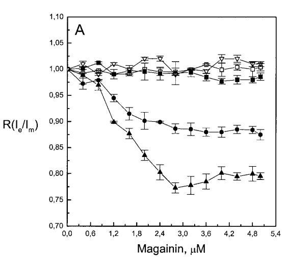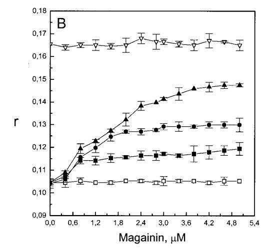 有趣的是,在存在酸性磷脂的情況下,肌動(dòng)蛋白/脂質(zhì)的摩爾比(在該摩爾比下,肌動(dòng)蛋白的初始增量趨于穩(wěn)定)分別為1:21、1:16和1:12.5,對應(yīng)于XPG=0.1、0.2和0.4(圖2A),分別產(chǎn)生1:2、1:3和1:5的肌動(dòng)蛋白/磷脂化學(xué)計(jì)量比。同時(shí),DPH的初始r增量在magainin/脂質(zhì)摩爾比為~1:30、1:12和1:5時(shí)趨于平穩(wěn)(XPG分別為0.1、0.2和0.4),對應(yīng)于大約1:3、1:2.5和1:2的magainin/PG化學(xué)計(jì)量比(圖3)。據(jù)報(bào)道,在這些肽/脂質(zhì)摩爾比下,magainin可插入含酸性磷脂的膜中(Ludtke等人,1994年)。此外,已經(jīng)證明,雙分子層中magainin的=-螺旋的方向取決于肽與脂質(zhì)的摩爾比,在上述化學(xué)計(jì)量比下,螺旋應(yīng)垂直于膜表面插入,在含PG的膜中形成孔(Ludtke等人,1996)。這些孔不僅由兩親螺旋的極性面組成,而且還由脂質(zhì)的極性頭基組成,內(nèi)外單層通過這些孔襯脂質(zhì)是連續(xù)的。膜中的這種結(jié)構(gòu)可能會(huì)降低探針芘部分微環(huán)境的極性,從而提高其量子產(chǎn)率。有趣的是,當(dāng)XPG>0.1時(shí),magainin 2逐漸降低Ie/Im值(圖3 A),這與增強(qiáng)的?;滍樞驕p少脂質(zhì)側(cè)向擴(kuò)散的速率一致。然而,由于magainin 2已經(jīng)在XPG=0.1時(shí)增加了r,Ie/Im沒有變化,我們可以得出結(jié)論,PPDPG探針向微區(qū)富集以及其橫向擴(kuò)散的減少正在發(fā)生。