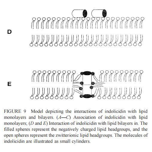 吲哚西丁只含有13個(gè)氨基酸,因此太短,無法跨越雙層。然而,該肽可以作為聚集物或帶有相關(guān)酸性磷脂的頭尾二聚體橫跨雙層(圖9 E),從而導(dǎo)致膜不穩(wěn)定性。已經(jīng)證明,吲哚西丁能夠通過穿過外膜殺死革蘭氏陰性細(xì)菌,并通過形成通道破壞細(xì)胞質(zhì)膜(Falla et al.,1996)。與magainin 2的作用相比,吲哚青霉素誘導(dǎo)的內(nèi)吞小泡較小(圖7)可能反映了這些肽與脂質(zhì)相互作用的不同模式。一些吲哚肽分子可能會(huì)轉(zhuǎn)移到膜的內(nèi)部小葉中。除了具有廣譜的抗真菌和抗菌活性外,吲哚西丁對哺乳動(dòng)物細(xì)胞也有毒性(Schluesener等人,1993年;Ahmad等人,1995年)。有趣的是,吲哚西丁對SOPC和SOPC膽固醇巨型脂質(zhì)體的作用不同。在這一階段,根本原因尚不確定,可能與膽固醇對雙層結(jié)構(gòu)以及吲哚肽在膜中的取向的影響有關(guān)。因此,需要進(jìn)一步的研究來闡明膽固醇對吲哚肽膜結(jié)合的影響。