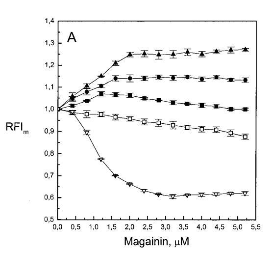 除上述相似性外,當(dāng)使用芘標(biāo)記的脂質(zhì)類似物研究酸性磷脂對脂質(zhì)動(dòng)力學(xué)的影響時(shí),兩種肽之間也存在明顯差異。Magainin 2導(dǎo)致兩性磷脂組成的LUV的芘發(fā)射顯著猝滅(圖2A)。然而,在PG存在的情況下,芘的單體強(qiáng)度增加,XPG逐漸增加了這種效應(yīng)的幅度(圖2A)。圓二色性、拉曼光譜、傅里葉變換紅外光譜和固態(tài)核磁共振研究表明,馬蓋寧在與脂質(zhì)雙層結(jié)合時(shí)采用螺旋構(gòu)象(Matsuzaki等人,1989年、1991年;Williams等人,1990年;Jackson等人,1992年;Bechinger等人,1993年;Wieprecht等人,1997年;Hirsh等人,1996年)。magainin 2對兩種膜的這些不同影響可能是由于1)通過與肽的帶正電基團(tuán)(例如賴氨酸的?氨基)直接接觸使芘熒光猝滅,或2)插入雙層的=-螺旋肽改變熒光團(tuán)的微環(huán)境,與層平面平行,如上所述。然而,在PG存在的情況下,肽的正電荷應(yīng)在與酸性磷脂形成靜電復(fù)合物時(shí)被中和,從而減少由于π-陽離子相互作用導(dǎo)致的芘熒光猝滅。