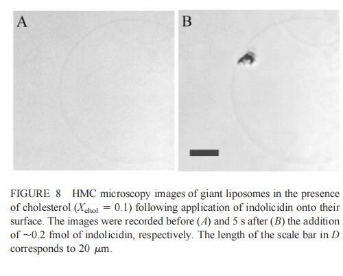 隨后,我們研究了吲哚西丁對由SOPC和膽固醇組成的巨大脂質(zhì)體(Xchol?0.1)的影響。吲哚西丁在膽固醇存在的情況下也會(huì)引起巨大脂質(zhì)體的起泡。形成的內(nèi)吞小泡在巨大小泡的表面上深度聚集(圖8b)。具體地說,在添加約0.2 fmol吲哚西啶(~400 fl,20次注射,圖8 B)后約5 s內(nèi),巨大脂質(zhì)體表面出現(xiàn)一簇小顆粒。隨后,聚集物轉(zhuǎn)移到巨大的脂質(zhì)體中,同時(shí)也有少量內(nèi)吞顆粒(θ≈0.9米)處可見。進(jìn)一步添加吲哚西丁會(huì)增加這些顆粒的數(shù)量,并導(dǎo)致巨大脂質(zhì)體收縮。然而,即使在暴露于~2 fmol吲哚西?。?00次注射,數(shù)據(jù)未顯示)的情況下,膜大體上仍保持完整。