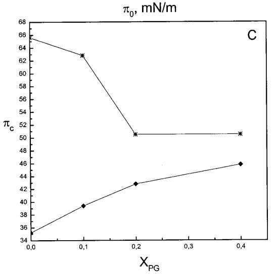 通過測量表面壓力的增量,觀察到抗菌肽在不同初始表面壓力(π0)下嵌入到空氣/水界面上的脂質(zhì)單層中(?π)將肽添加到亞相后(Brockman,1999;Verger和Pattus,1976)。Magainin 2在π0>12 mN/m時(shí)容易插入SOPC單層(圖1A),而在π0以上≈35 mN/m時(shí),其在膜中的滲透被消除,因此該值表示該肽與SOPC膜相互作用的臨界包裝壓力πc。根據(jù)其凈正電荷4(Matsuzaki,1998),當(dāng)膜中酸性磷脂POPG的含量增加時(shí),magainin 2向脂質(zhì)單層的滲透逐漸增強(qiáng)(圖1 A)。因此,消除magainin 2插入單層的πc值增加至~39(XPG=0.1)、43(XPG=0.2)和46 mN/m(XPG=0.4)(圖1c)。相反,在SOPC膜中加入膽固醇(Xchol=0.1)對magainin 2的滲透沒有顯著影響(圖1A)。