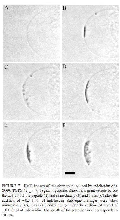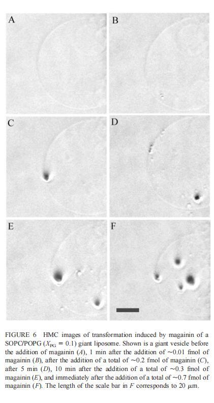 由于上述magainin 2和吲哚西啶對單層和LUV具有明顯的脂質(zhì)成分依賴性作用,因此有興趣使用巨型脂質(zhì)體比較這些肽對宏觀膜的三維拓?fù)浣Y(jié)構(gòu)的影響,無論是否含有PG,都可以在交流電場中形成由SOPC組成的巨大脂質(zhì)體。即使暴露于大量肽(~2 fmol,~4 pl=200次重復(fù)注射,數(shù)據(jù)未顯示),SOPC膜也不受magainin 2的影響。同樣,由SOPC和膽固醇(Xchol=0.1)組成的巨大脂質(zhì)體也不受此量的馬蓋寧2的影響(數(shù)據(jù)未顯示)。然而,在存在POPG(XPG=0.1)的情況下,已經(jīng)~0.01 fmol(單次~20 fl注射)的magainin 2應(yīng)用于巨大囊泡表面,顯著影響巨大脂質(zhì)體膜的拓?fù)浣Y(jié)構(gòu)(圖6 B)。更具體地說,在~1分鐘內(nèi),小顆粒(θ≈0.9米)出現(xiàn)在巨大的囊泡內(nèi)。隨后注射高達(dá)~0.1 fmol(約200 fl)的magainin 2不會(huì)引起進(jìn)一步的可見變化。在總共添加約0.2 fmol的肽后,膜開始起伏,形成致密顆粒(θ≈4 m)在巨大脂質(zhì)體內(nèi)可見(圖6 C)。在~5分鐘內(nèi),幾個(gè)小顆粒(θ≈0.9 m)出現(xiàn)在巨大脂質(zhì)體膜的內(nèi)表面(圖6 D)。隨后,大多數(shù)小顆粒進(jìn)入巨大囊泡的內(nèi)腔。這些內(nèi)吞小泡似乎在巨大脂質(zhì)體內(nèi)自由移動(dòng),在隨后30分鐘的觀察中沒有進(jìn)一步的變化。進(jìn)一步注射magainin 2,提供總共0.3 fmol的肽,引起類似內(nèi)吞作用的過程,出現(xiàn)直徑約8 m的致密顆粒(圖6 E)。約10分鐘后,巨大脂質(zhì)體內(nèi)約0.9-m顆粒的數(shù)量繼續(xù)增加。偶爾,這些顆粒也出現(xiàn)在巨大囊泡的外表面,并釋放到外部緩沖液中(圖6 E)。隨后添加magainin 2(~0.7 fmol)使膜不穩(wěn)定并誘導(dǎo)進(jìn)一步的囊泡形成(圖6 F)。這些內(nèi)吞囊泡在巨大脂質(zhì)體內(nèi)彼此分離,巨大囊泡的大小明顯減?。▓D6f)。最終,在進(jìn)一步添加magainin 2(高達(dá)~1.5 fmol)后,巨大的脂質(zhì)體膜崩塌。上述形態(tài)學(xué)變化具有高度的可重復(fù)性。