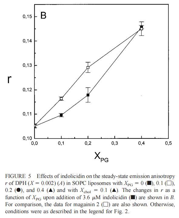 雖然熒光光譜顯示,馬蓋寧2和吲哚西啶對脂質(zhì)動(dòng)力學(xué)的影響存在明顯差異,但也存在一些明顯的相似之處。因此,DPH各向異性r的增加表明,在存在酸性磷脂的情況下,這兩種肽都會(huì)導(dǎo)致?;滍樞虻脑黾樱@種影響的程度隨著XPG的增加而增加(圖3b和5b)。同樣,在膽固醇存在的情況下,兩種肽對芘熒光的有效猝滅也很明顯(圖2a和4a)。這可能與膽固醇的OH基團(tuán)和馬蓋寧的E19殘基之間的相互作用有關(guān)(Tytler等人,1995年),該肽在膜中具有跨膜取向。當(dāng)Xchol=0.1時(shí),r值的增加是由于吲哚西丁所致,而馬加寧則無影響。這表明,在膽固醇存在的情況下,吲哚肽可能采用跨雙層取向,其長軸垂直于雙層平面。