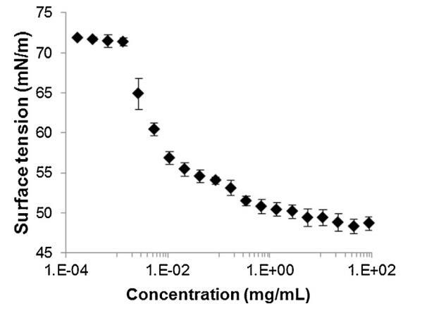 圖2。牛精漿溶液在空氣-水界面的表面張力(±標準偏差),與提取物中所含蛋白質(zhì)的濃度有關(guān),并以對數(shù)標度表示(T=23.2?C±0.3?C、n=2,每個樣品重復4次)。