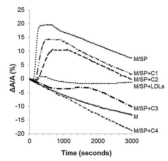圖5。注入(…)后,由單層(M)覆蓋并在不含(-)額外分子的緩沖液上形成的界面的相對表面積隨時間的變化SP(26.6±1.5 mg蛋白質(zhì))、SP(26.6±1.5 mg蛋白質(zhì))和不同濃度(··-)C1、(·-)C2的脂質(zhì)體的混合物,(·-)C3和(·-)C4(分別為1.17±0.02 mg、2.18±0.02 mg、4.37±0.02 mg和6.55±0.02 mg脂質(zhì))和(---)LDL(4.6 mg PC)和SP(26.6±1.5 mg蛋白質(zhì))的混合物。氣溫是34度?C在空氣-緩沖器接口處。表面壓力保持在25 mN/m。