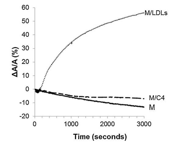 圖4。單層(M)所覆蓋的界面的相對表面積隨時間的變化,該單層(M)以25 mN/M的速度壓縮,并在不含任何額外分子(-)的緩沖液上形成,(…)LDL(4.6 mg PC)和(-)脂質(zhì)體C4(含4.8 mg PC)。氣溫是34度?C在空氣-緩沖器接口處。