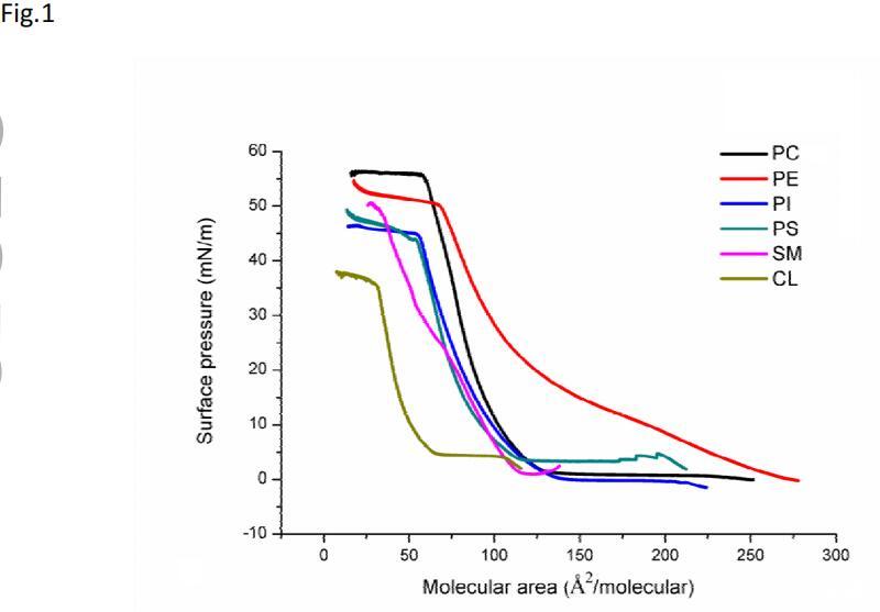 圖1顯示了空氣-水界面上不同磷脂單層的π-A曲線形狀。這里測試的所有磷脂的π-A曲線的形狀都是在所有顯示的表面壓力下單一液體膨脹(LE)和液體冷凝(LC)狀態(tài)的特征。在壓縮時,單層經歷了一個轉變,這被視為從LE(低于10 mN/m)到LC狀態(tài)的轉變。在高分子區(qū)域,由于分子堆積的增加,表面壓力升高,但不改變單層膜的彈性。最后,單分子膜達到了一種更為濃縮的狀態(tài),但在π-a等溫線的形狀中沒有明顯的崩塌點。對于這里測試的磷脂,它們都可以形成穩(wěn)定的膜,并表現(xiàn)出良好的壓縮性能,DOPC的表面壓力甚至達到57 mN/m。