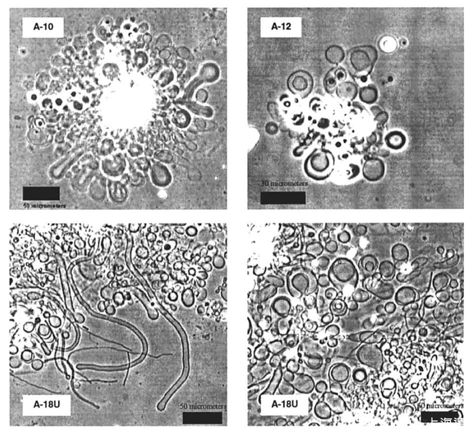 圖2。A-10(左上)、A-12(右上)和A-18U(下)在23°C下水合3-4小時后形成的囊泡和管狀結構的相襯顯微照片。在45°C下培養(yǎng)的A-14和A-16樣品中觀察到類似結構。