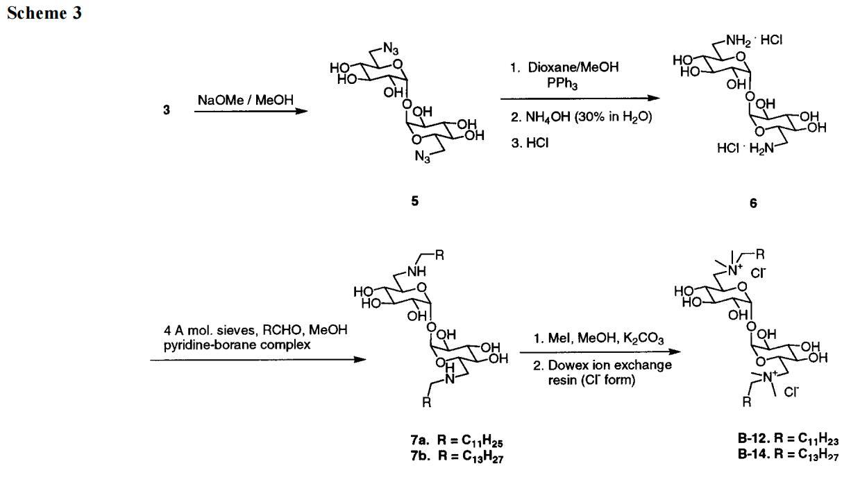 方案2和方案3以及實驗部分詳述了我們獲得A系列和B系列海藻糖雙子的方法。另外幾條評論有助于美化這一信息。B型海藻糖雙子最明顯的先驗途徑是用長鏈叔胺直接取代2的甲苯磺?;鶊F。盡管沿著這些路線進行了多次嘗試,但只獲得了分解產物或起始材料。然而,如方案2所示,我們成功地用疊氮化合物取代了2的兩個甲苯磺?;?,得到了3。此處采用文獻程序28,但出于安全考慮,HMPA被DMPU取代作為溶劑。然后,雙疊氮化物3經過Staudinger反應25,29,在一個步驟中得到長鏈雙酰胺4a-g,而該長鏈雙酰胺4a-g只需脫保護即可獲得a系列雙子。在方案3中,脫保護糖5的疊氮化物還原將化合物轉化為二伯胺鹽酸鹽6。長鏈醛與6和吡啶硼烷絡合物30的還原胺化得到海藻糖衍生物7。使用NaBH3-CN作為還原劑,該反應的產率很低。在用甲基碘化物將7甲基化,然后進行離子交換(以促進純化和提高溶解性)之后,我們得到了B系列海藻糖雙子。