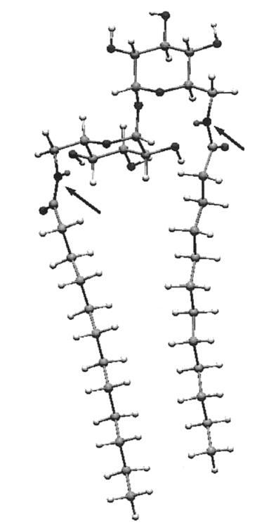 計算首先將海藻糖插入宏模型程序42,并對結構進行琥珀色能量最小化。從使用琥珀色*力場的25000個構象搜索中,我們選擇了能量最低的構象,該構象恰好與報告的X射線結構重疊。43,44接下來,該結構中的6-和6′-羥基被乙酰氨基取代。在模擬的水環(huán)境中,用AMBER*再次進行了25000次構象搜索。然后乙?;皇榛〈缓髮ι傻腶-12雙子座進行了另一次搜索。結果表明,整個構象由酰胺羰基和相鄰葡萄糖環(huán)的2-羥基之間的兩個分子內氫鍵控制。氫鍵導致兩條全反式鏈彼此擺動約95°。A-12的固態(tài)紅外光譜證實了這種相互作用,該光譜顯示1646 cm-1處有羰基帶,而Hecameg的羰基帶為1700 cm-1,單體葡萄糖類似物的羰基帶為1698 cm-1。25由于這種構象會不切實際地排除分子內疏水締合,而且在任何情況下,羰基氫鍵位點的溶劑可能會淹沒在水中,我們故意不允許-CdO氫鍵,并重新計算。通過這種方式,我們得到了圖6。可以看到,一條鏈上大約有八個碳與其伙伴鏈的碳并排排列。N/N距離僅為7.4?,整體分子形狀為“管狀”。用另一種方式說,糖的頭基延伸的距離不比兩條鏈的寬度大多少,就像人們預期的一種易于堆積成雙層的化合物那樣。45因此,正如前面從實驗數據得出的結論,海藻糖更像是一個統(tǒng)一的頭基,而不是一個可以有效隔離鏈的長間隔基。